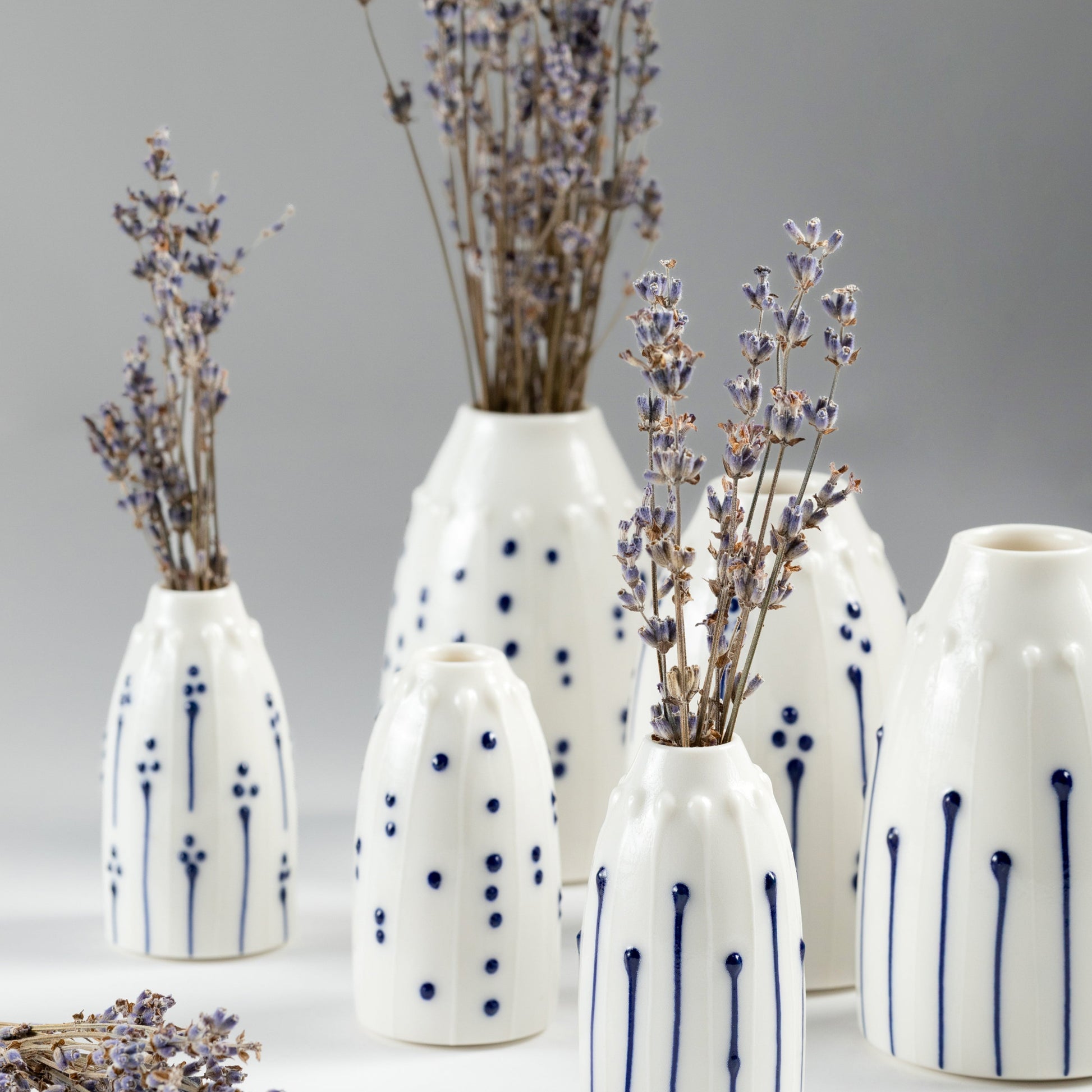 This handmade porcelain bud vase is wheel-thrown from Ming porcelain in my Dublin studio and decorated by hand in blue and white. Its compact form is perfect for displaying a single flower or small stem, bringing a delicate presence to any surface.